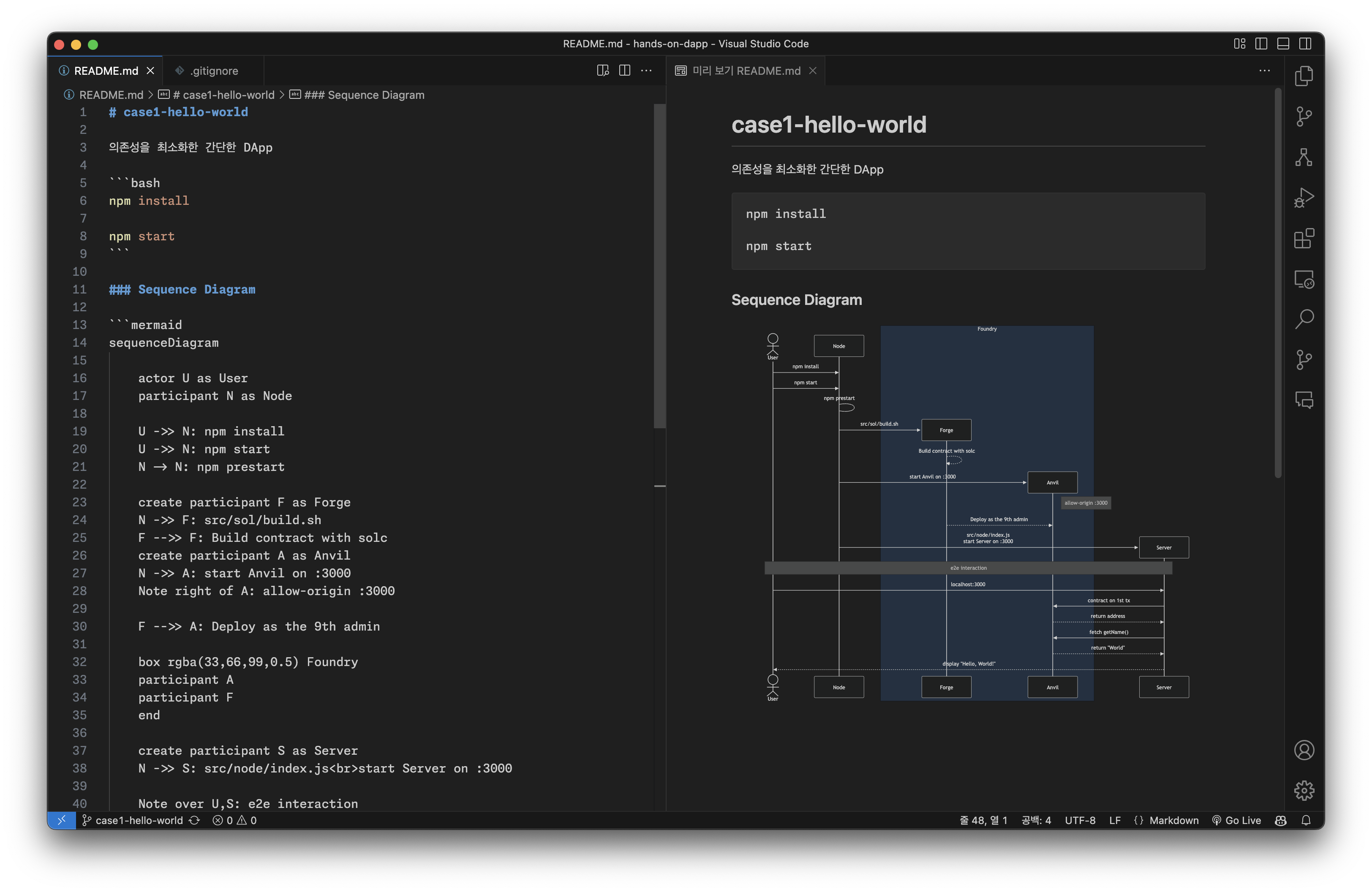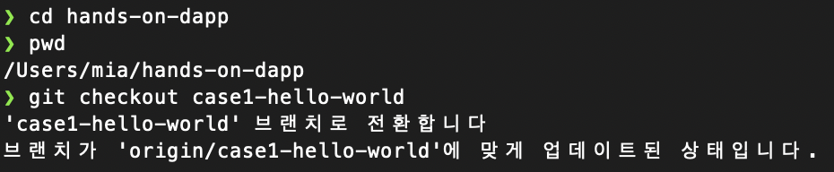 readme.md의 안내에 따라 git checkout case1-hello-world 를 실행합니다.