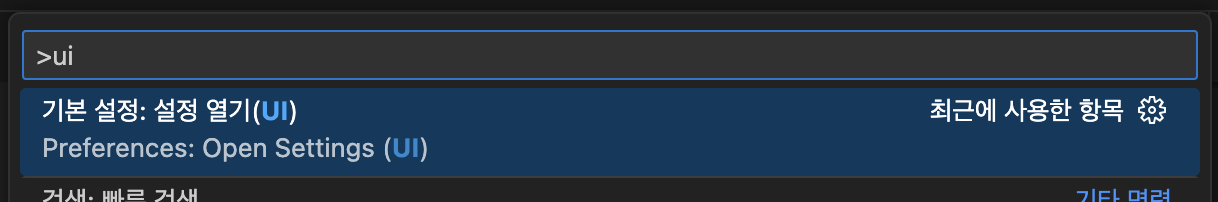 - VS Code 자체의 개인화된 설정 차이입니다. IDE의 테마라든지, 바의 위치와 구성 등 원하는대로 변경할 수 있습니다. ⌘ + ⇧ + P (cmd + Shift + P)를 누르고, ui를 입력한 뒤, 기본 설정을 열어 여러분만의 설정으로 변경해보세요!