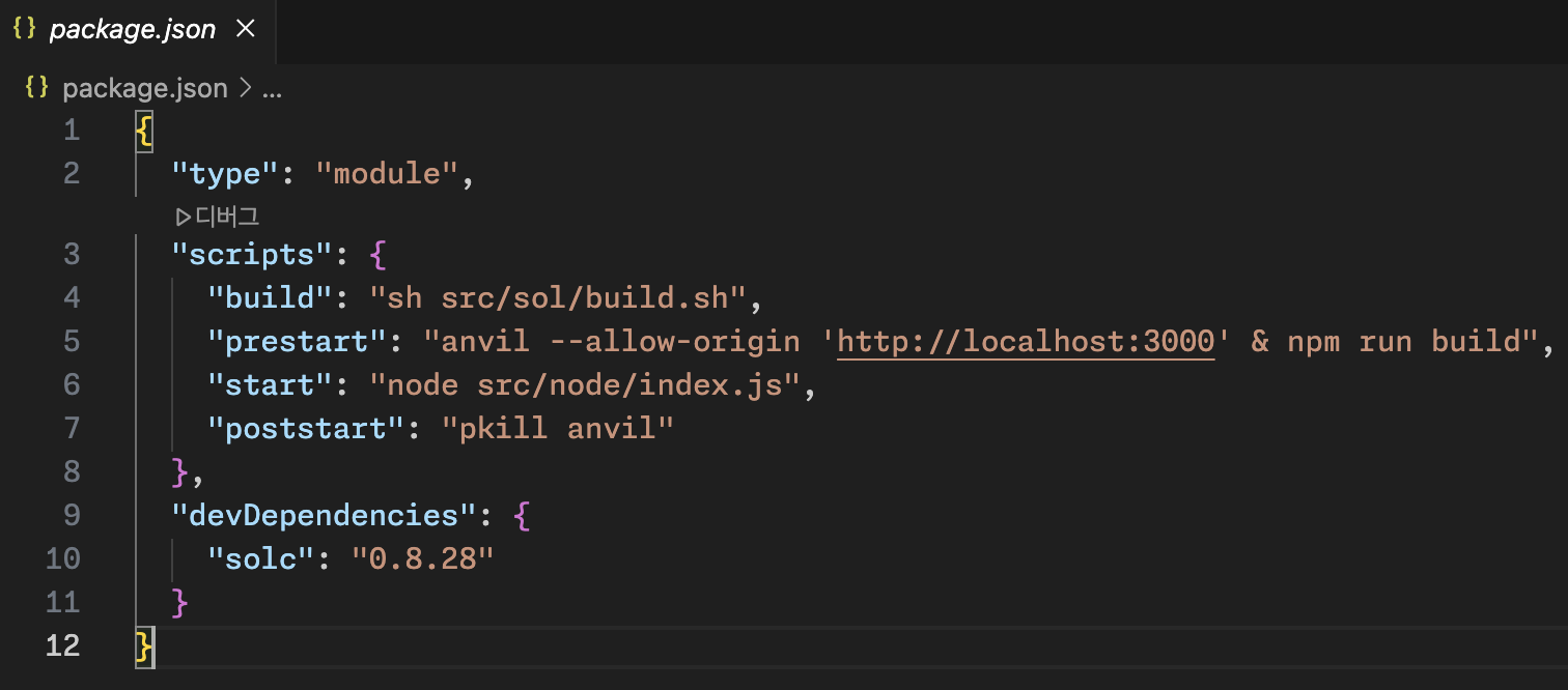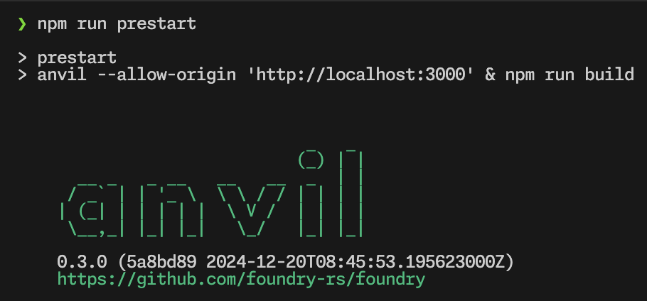 npm start는 Node 기반 프로젝트에서 관습적으로 실행을 의미하는 명령어입니다. 단, Script 생명 주기에 따라 prestart가 먼저 실행되겠네요. 이를 통해 anvil이 실행되고, build 명령이 수행됩니다.