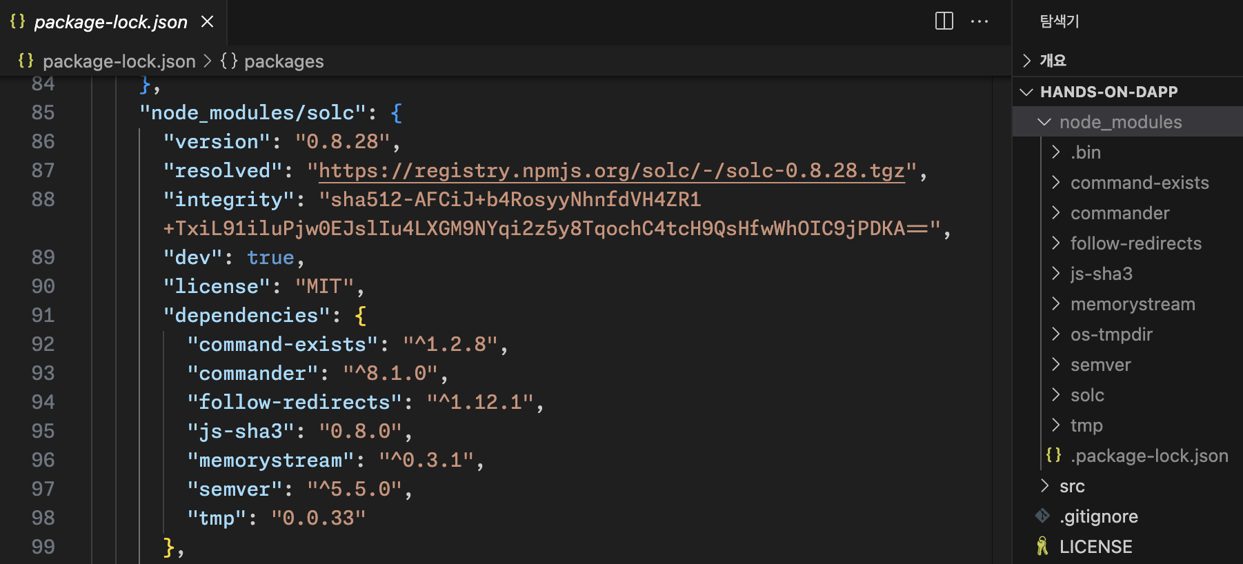 명령을 실행하면 앞서 개발 의존성으로 명시된 0.8.28 버전의 solc 패키지가 설치됩니다. 그리고 package-lock.json 파일과 node_modules 폴더가 생성되는데, package-lock.json은 의존성 패키지 트리를 정의하는데 사용되고, 모든 의존성은 node_modules 폴더 내에 로컬로 다운로드됩니다. 쉽게 말하면, 우리가 라면을 끓이는 프로젝트를 할 떄, 라면과 조리도구를 의존성에 명시하고 구매하면, 각각 라면은 건더기/스프/면, 조리도구는 냄비/젓가락/버너라는 하위 의존성까지 자동적으로 구매하는 것과 동일한 느낌입니다.