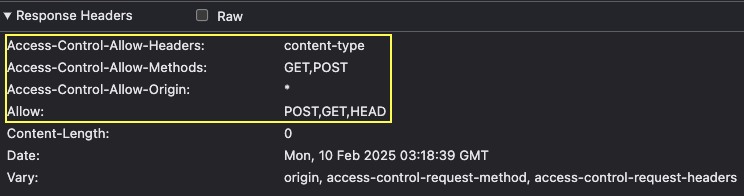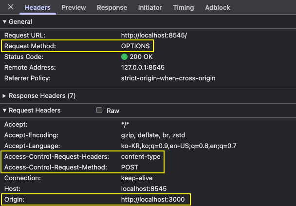 클라이언트가 다른 출처로부터의 자원을 허용하기 위해서는 어떻게 해야 할까요? 단순히 클라이언트가 원한다고 되는 것이 아니고, 서버에서 알맞은 CORS 설정을 해주어야 합니다. 이러한 맥락에서, 실행한 명령어 anvil -- 뒤에 명시된 allow-origin 옵션은 Cross Origin Resource Sharing(CORS, 교차 출처 자원 공유) 방식에 따라 허용하고 싶은 호스트를 정의하기 위한 옵션이에요. remote에서 첫 번쨰 사진처럼 preflight를 전송하여 origin 서버의 정책을 확인하고, 응답 헤더를 받아 그에 맞게 동작합니다. 필요하다면 Dreamhack의 CORS 취약점 강의를 수강하는 것도 이해에 도움이 될 거에요!