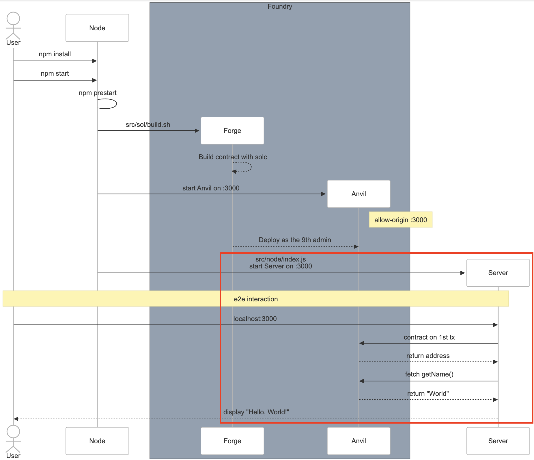 이전 시간에는 로컬 체인을 구동시키고, 스마트 컨트랙트를 작성하여 배포해봤습니다. 이번 시간에는 웹 서버를 가동시키고, 클라이언트에서 스마트 컨트랙트의 함수를 호출해서, 그 결과를 화면에 출력하는 작업에 대해 알아봅시다. 들어가기 앞서, 이 프로젝트는 의존성을 최대한 제거하여 동작 원리를 보여주는 것에 목적이 있습니다. 따라서, 지금 당장 이해가 가지 않는 부분이 있더라도 그냥 '그렇구나'하고 읽고 넘어가도 괜찮습니다. 단, 이전 시간에 실습했던 부분에서 이어지기 때문에, 1. Anvil이 동작 중인지 2. 스마트 컨트랙트를 배포했는지 확인하고 진행합시다.