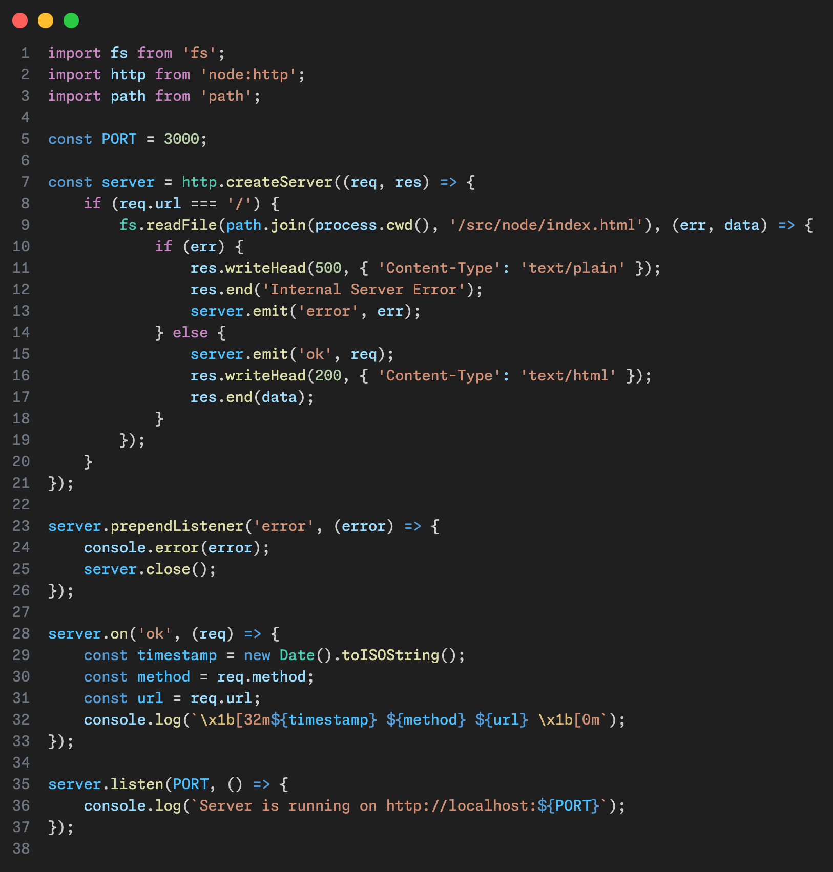 이번 프로젝트에서 서버의 역할은 단순히 사용자가 localhost:3000에 접근했을 떄, 클라이언트에게 HTML 파일을 반환하는 것입니다. node의 내장 모듈을 사용해서 요청 URL에 대한 라우트를 처리합니다. 알아두어야 할 점은 현재 모든 로직이 HTML 파일 내에 스크립트로 작성되어 있다는 것입니다.