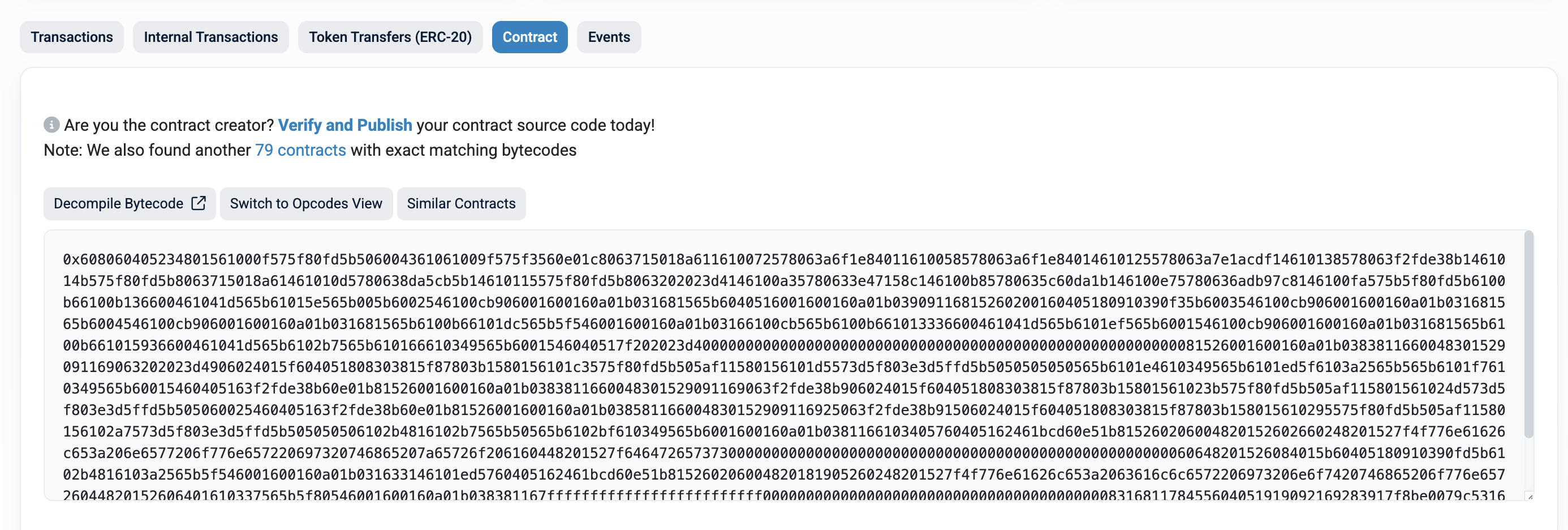 etherscan은 가장 널리 활용되는 Block Explorer입니다. 최근에는 오픈소스인 blockscout 쪽도 꽤나 인기있지만, 일단은 etherscan을 사용하고자 합니다. API_KEY가 필요한 것은 이 익스플로러에 컨트랙트 코드를 인증하기 위함입니다. 인증된 컨트랙트는 다음과 같이 소스 코드가 보이게 됩니다. 인증되지 않은 경우, 바이트코드 형태로 보여서 별도의 디컴파일러 사용 없이는 보기가 불편하거든요.