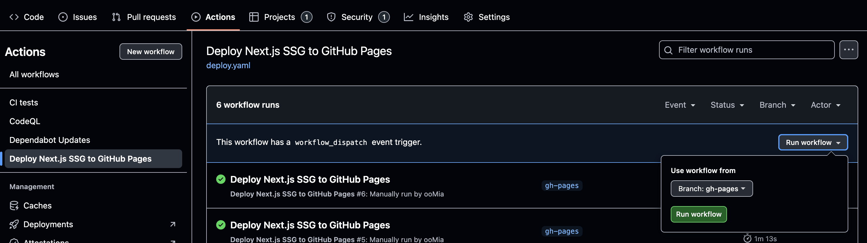 Pages로 배포하기 위해선 포크한 레포에서 'GitHub Actions로 배포' 설정을 해주어야 합니다. 이후에는 .github/workflows/deploy.yaml에 명시된 배포 워크플로우를 트리거하면 끝입니다. actions/configure-pages@v5를 통해 baseUrl을 설정하는 디테일이나 캐싱 등 GitHub Actions 활용과 관련한 내용은 자세히 다루지 않겠습니다.