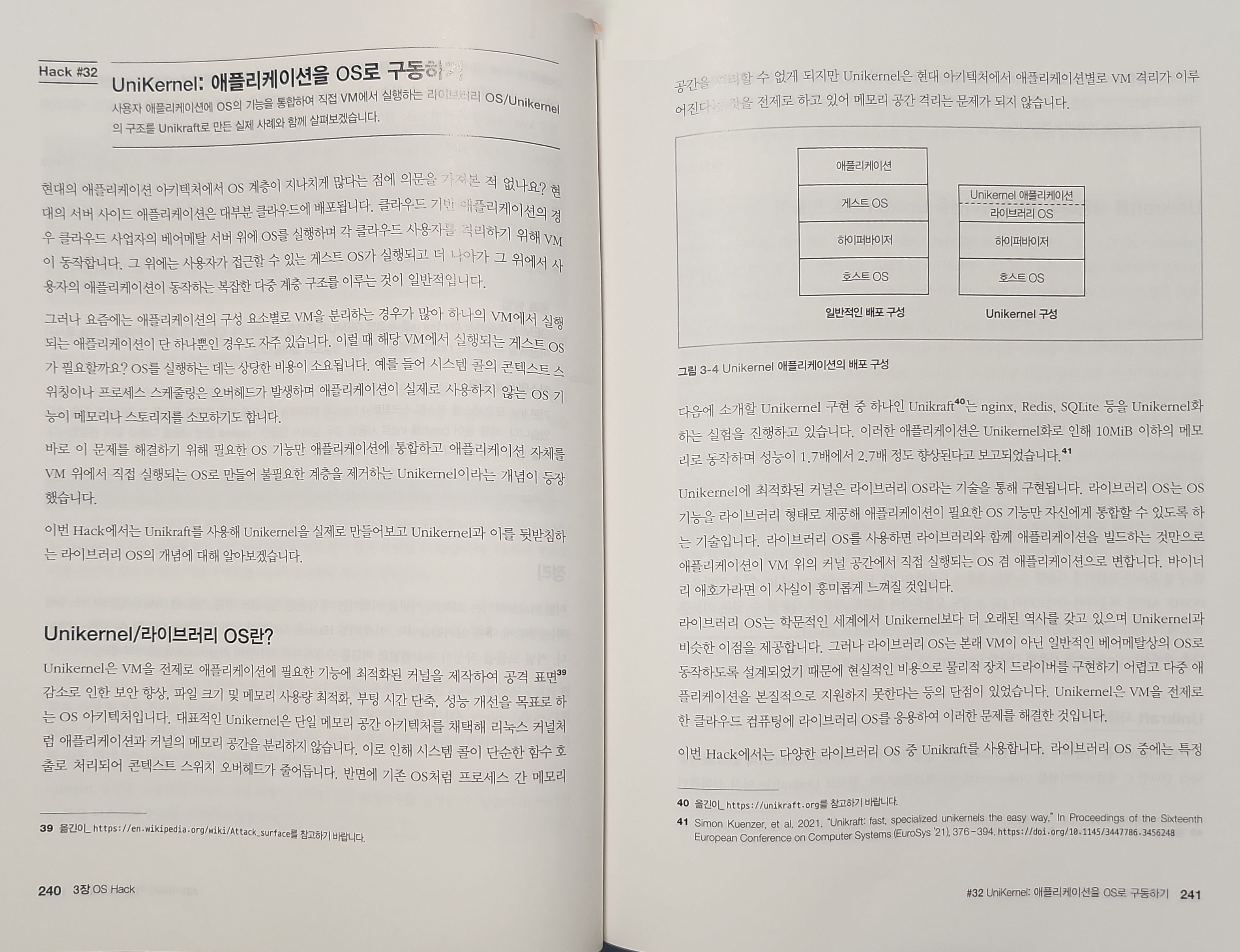 이번에 알게된 Unikernel도 정말 참신한 아이디어라 생각한다. 기존에 alpine 버전이나 Dockerfile을 활용하여 간소화한 빌드를 만드는 차원이 아니라, 애플리케이션에 필요한 기능만 탑재하여 커널 수준에 최적화하는 방식이다. 빌드 크기 감소와 성능 개선은 당연하고, 공격 표면을 감소시켜 보안을 향상시킬 수 있다는 점이 핵심이라 생각한다. 이로서 특정한 이미지에 취약점이 발견되더라도, 향후에는 해당 기능이 의존하는 시스템 콜을 포함하는 기능을 이미지에서 제외하고 빌드하는 식으로 실시간 패치가 가능해질지도 모른다.