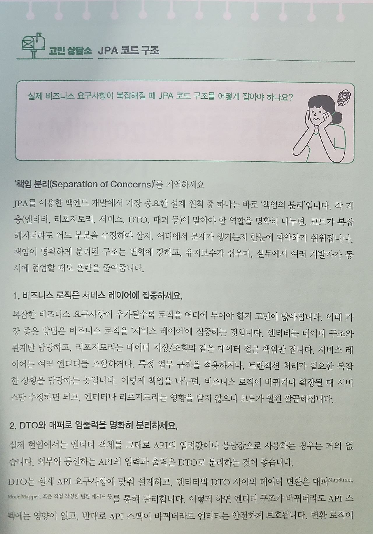 사용하는 기술의 원리를 알아도, 어떻게 프로그래밍을 해야하는지 모르거나 프레임워크 내에서 어떻게 지원하는지 모르면 헤맬 수 밖에 없다. 이러한 관점에서 이 책은 다양한 관점과 방식으로 설명을 제공한다. 고민 상담소 섹션을 통해 향후의 고도화를 위한 실무적인 조언을 얻을 수 있고, 도식을 통해 프로젝트의 구조와 동작 순서에 대한 정보를 얻을 수 있다. 또한 예제 코드를 통해 모든 단계를 직접 수행하지 않더라도 빠르게 시작할 수 있다. 설명 주석 또한 풍성하게 제공되며, 최초에 저자가 밝힌 집필 의도처럼, 이를 통해 업무에 빠르게 적응할 수 있다.