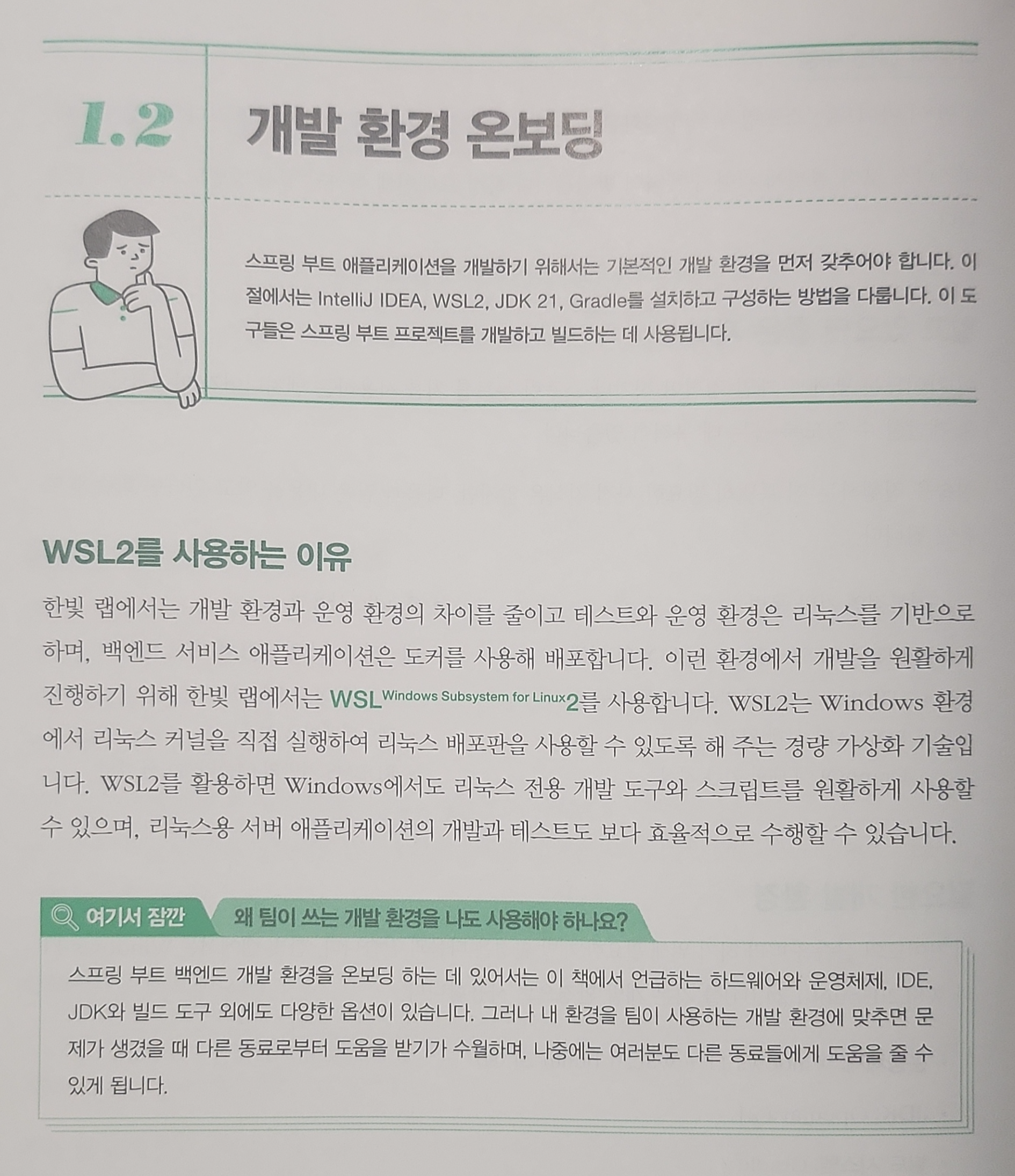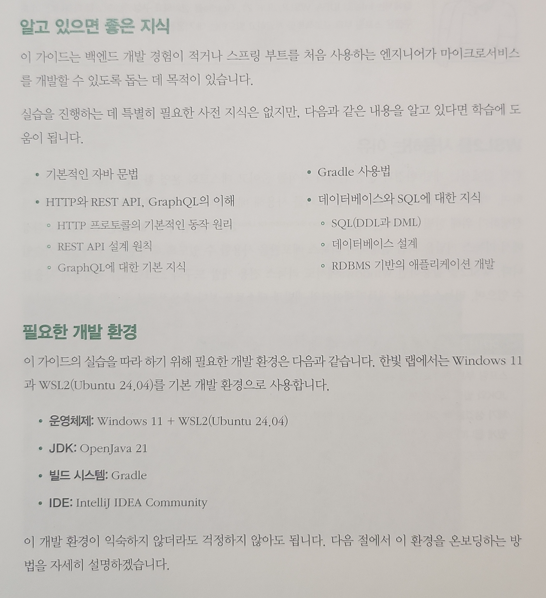 새로운 언어를 접했을 때의 기억들을 떠올려보면 프로그래밍보다 그걸 준비하는 과정에서 겪는 어려움이 더 컸다. 자주 접할 기회가 없어 익숙하지 않은 것도 있지만, 가령 시스템 경로와 관련되어 문제가 발생한다고 하면, 개인의 설정이란 결국 정답이 없는 영역이니까. 이런 건 검색해서 누군가의 설정을 똑같이 따라한다고 문제가 해결되리라는 보장도 없다. 그래서 이 책은 개발 환경을 구축하는 방법을 설명하는 것에서 시작한다. 가장 보급률이 높은 OS인 Windows 환경에서, 가장 개발 친화적인 Linux 환경에서 작업하기 위해 WSL2를 활용한다. Docker와 IntelliJ, SDKMAN을 포함하여 최대한 실무에 가까운 환경을 구축한다.