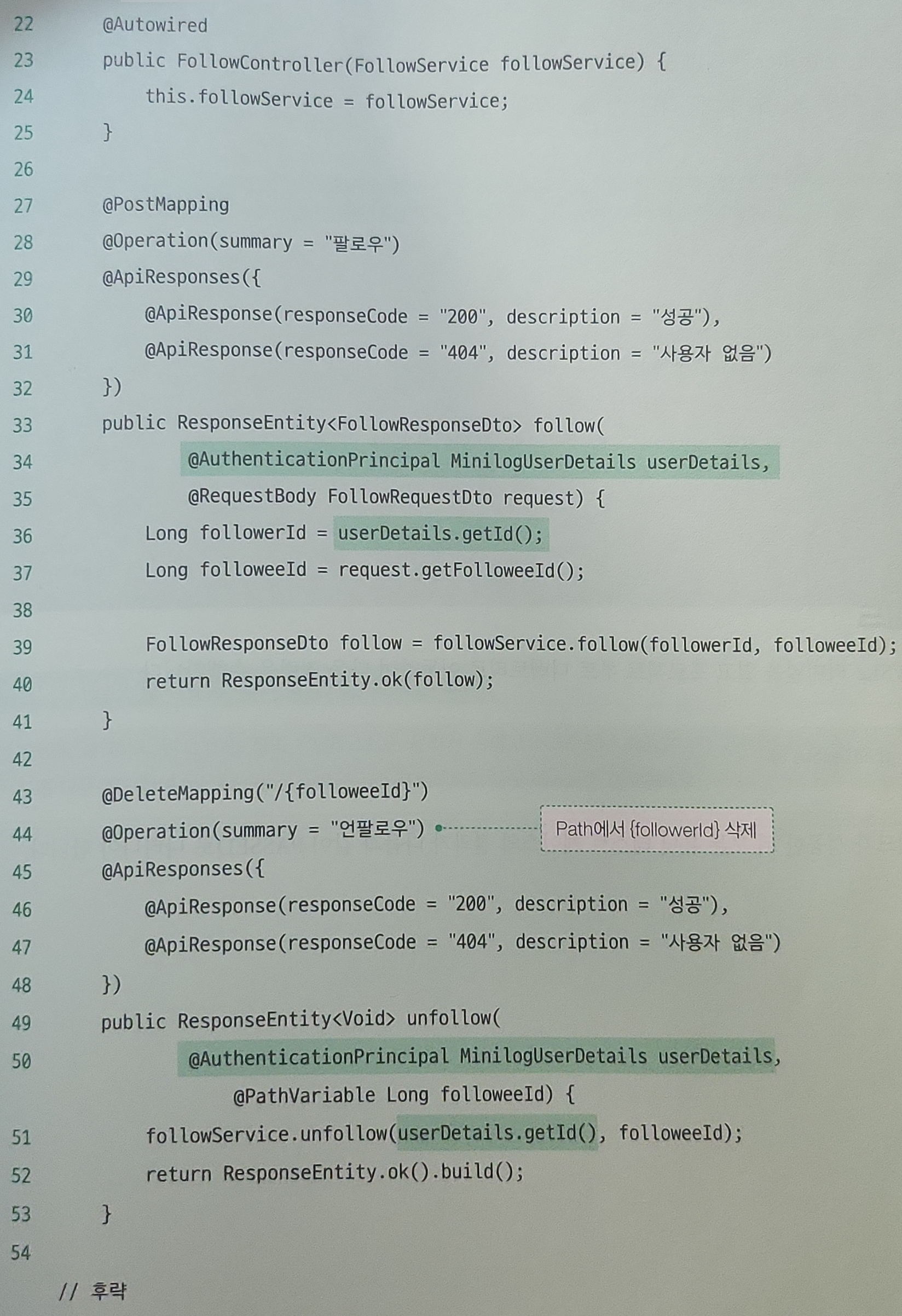 단계적으로 확장해나가는 방식은 실제 개발 플로우와도 연관성이 있다. 빠르게 핵심 기능을 완성하고 별도의 계층을 추가하거나 통신 방식을 변경하는 등 요구사항이 변화함에 따라 어떻게 대처해야 하는지에 대한 모습을 확인할 수 있다. 또한 목표로 하는 기능을 추가하면서 필연적으로 기존 코드의 수정/삭제가 이루어진다. 이러한 변화에 직접적인 수정이 필요한 경우 사진처럼 강조 표시를 해두었고, 단순 수정 외에도 API versioning과 deprecated 표시 등 타인과의 협업까지 고려한 것을 보며 실무를 반영하기 위해 노력했다는 인상을 받았다.