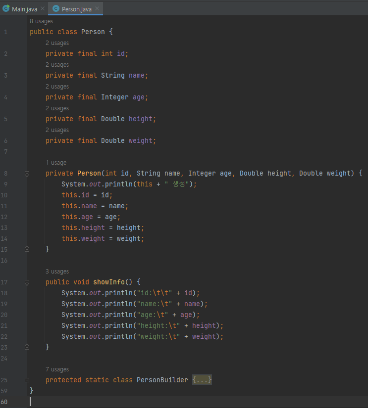 Person 클래스는 이후 PersonBuilder 내부 메소드를 사용해야 하므로,