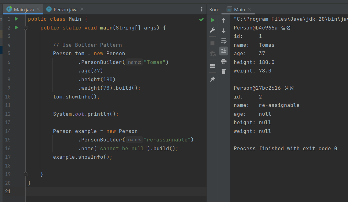 마지막 return this; 구문을 통해 이전 PersonBuilder를 이어받아 연속적인 초기화가 가능하다.