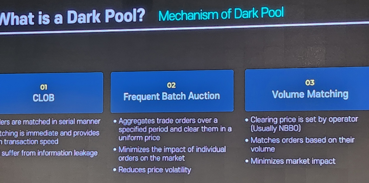 정보 유출이 발생하는 기존 CLOB (Central Limit Order Book) 방식과는 달리, Dark pool은 주문이 공개되지 않고, volume matching 방식을 통해 대량 주문을 비공개로 매칭하는 탈중앙화 거래 플랫폼이다. 이를 통해 투자자들은 시장의 반응을 최소화하며 고액/대형 주식을 거래할 수 있게 된다.