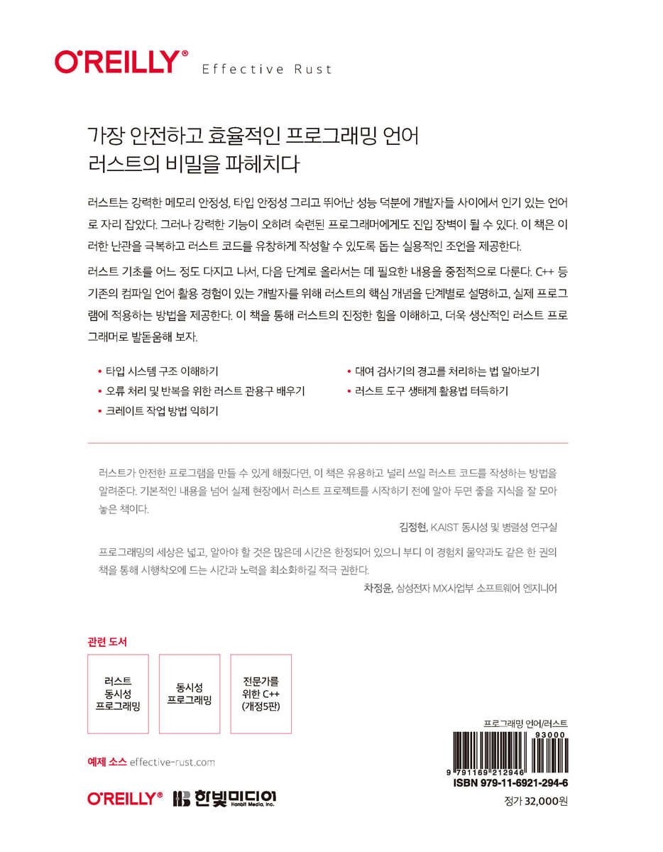러스트 사용 경험이 거의 전무한 상황이라 솔직히 책을 집어들었을 때, 어디부터 어떻게 읽어야 할 지 다소 막막했다. 펼치는 곳마다 이해하기 어려운 내용들이 펼쳐져 있었는데, C++의 확장판이라 생각하고, 그 차이점에 집중해서 기초를 공부한 이후에 읽으니 이전보다는 나았던 것 같다. 다른 개발자분들도 본 서적을 중급서라고 표현하시는 이유를 이해할 것 같다. 그렇다고 책의 가치 자체를 판단하지 못할 정도는 아니다. 이 책은 언제든 참조할 수 있도록 잘 정리된 아이템을 중심으로, 예제와 edge case를 담은 좋은 책이다. Rust를 배우고자 하시는 분들은 이 기회에 초보자에서 중급자로 한 단계 성장할 수 있을 것이라 생각한다.