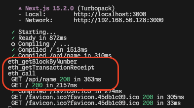 위에 찍힌 Anvil 로그를 보니, on-chain 데이터를 가져오는 것 같은데, 이 내용은 어디에서 처리되는 걸까요? Next.js에서는 컨벤션 기반 내부 라우팅을 지원합니다. 그래서 page.tsx 대신 route.ts를 작성하는 것으로 custom request handler를 만들 수 있습니다. getName 함수를 받아 실행하는 간단한 구조네요! 특별히 이해하기 어려운 부분은 없을거라 생각해서 넘어가겠습니다. 혹시라도 자세한 내용이 궁금하다면 공식 문서를 참고하세요!