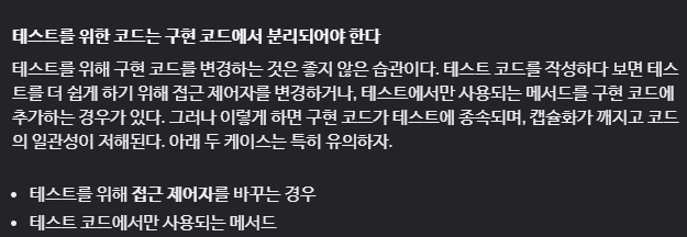 또한 이러한 부분들은 피드백을 통해 제재를 받았는데, **결과적으로 최대한 캡슐화를 지향하자**는 말은 누구나 할 수 있다. 이것이 분명 베스트 프랙티스는 아니지만, 막상 TDD를 기반으로 플로우를 이어나갈 때 현재의 테스트 문제를 지연시키면서, 구현의 유효성을 확보할 수 있는 한시적으로 효율적인 방법이라는 데에는 변함이 없다. 현재의 상황에 대한 문제를 인식하고, 리팩토링 과정에서 고치는 것이 우리의 다음 스텝이 되어야 한다.